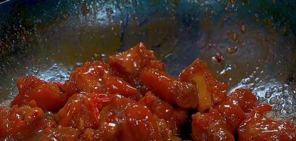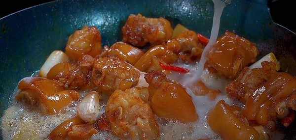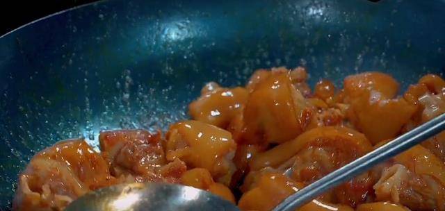 10.然後倒入瀝幹水的豬蹄,翻炒均勻上色。豬蹄水分要瀝幹,不然會炸鍋。