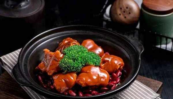 3.將豬蹄收汁,撈起後拆去骨,斬成小塊;紅腰果焯水,西蘭花焯水;砂鍋燒熱,倒入紅腰果和豬手,淋入汁裝入西蘭花即可