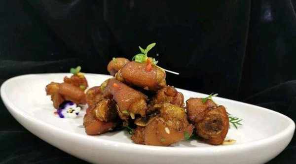 2.將撈起控水的豬手均勻地抹上生抽,倒入預熱油溫輕輕炸表皮,然後薑、蒜、香茅炒香,混合所有的醬料,炒香倒入炸好的豬蹄,烹入料酒註入鹵水一同煲制軟熟入味撈起斬件