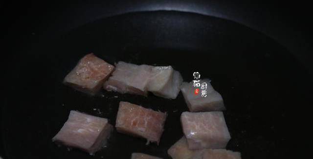 3.瘦肉切成塊,放入冷水鍋中燒開熱水,去掉部分血水雜質後盛,洗凈備用。