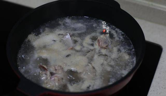 3.剁成塊的鴨肉要放入冷水鍋中,大火燒開,煮1-2分鐘,煮沸後的表面會有許多浮沫,都是鴨肉裡滲透出來的血水和雜質,用這個辦法也能去掉鴨肉的腥味。