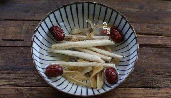 2.準備沙參2條,玉竹、紅棗、麥冬等加入適量清水,洗幹凈,去掉表面浮灰,再把沙參浸泡軟。