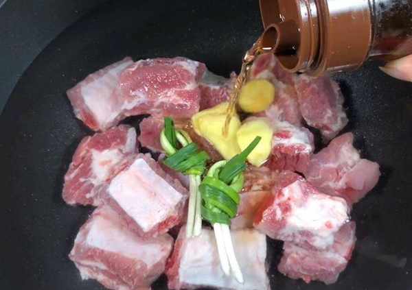 制作方法3、排骨冷水下鍋,加入去腥三料(蔥薑絲和料酒),焯水3分鐘,撈出控幹
