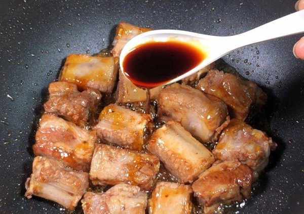 制作方法6、加入排骨翻炒裹勻上色,加入生抽