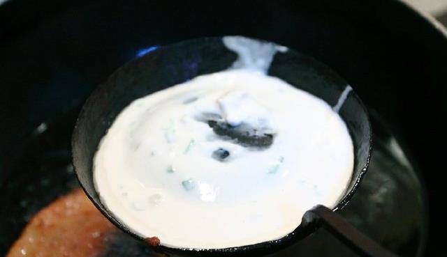 6、面窩勺燒熱後,往其中倒入1大勺黃豆米漿,再用勺子輕輕在中間凸起的地方敲打幾下,使凸起的部分漏出來