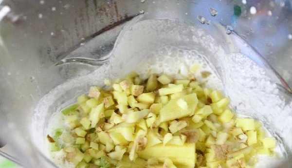 3、料理機接通電源,選擇研磨功能,等機會運轉1分鐘左右後暫停機器運轉,將切好的薑末和小蔥白放入料理機杯中,繼續啟動料理機,將大米和黃豆攪拌成黃豆米漿