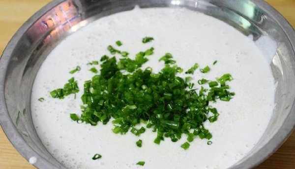 4、攪拌好的黃豆米漿倒入大碗中,加入切碎的小蔥葉和鹽末拌均勻。