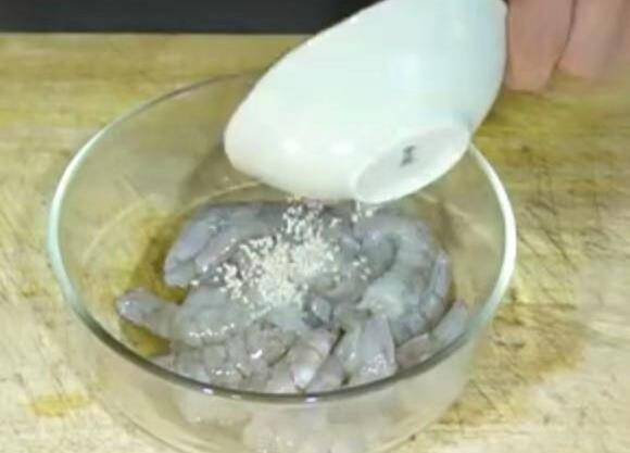 1、蝦仁去蝦線清洗幹凈,放入調味容器中,加入適量的鹽、料酒、胡椒粉抓拌均勻,至起黏後靜置醃漬入味;