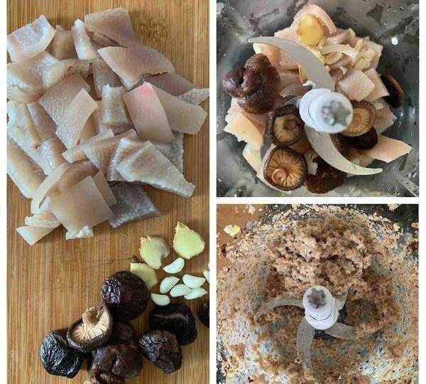 5.豬皮撈出,水留著備用。切小塊,薑片和蒜頭拍碎。把切好的豬皮、香菇、薑片和蒜頭全部倒進絞肉機裡絞碎。(沒有絞肉機的這一步就要手工剁碎啦!)