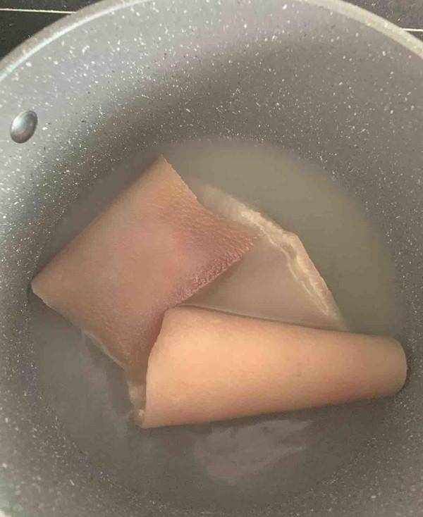 1.準備豬皮一塊,洗幹凈,放開水裡煮上5分鐘撈出,水不要。