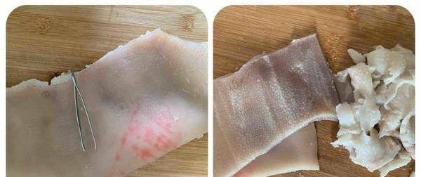 2.拔掉豬毛,刮凈油脂。也可以在豬皮未煮前把豬毛刮幹凈,不然煮過後就是要一根根拔瞭。