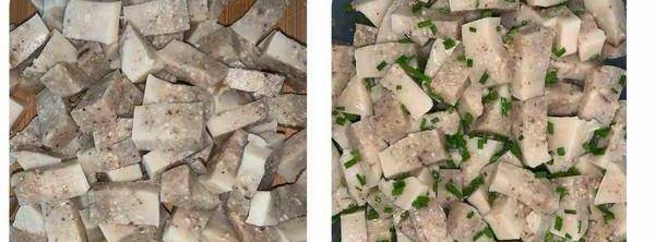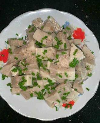 8.凝固後倒扣出來,倒出來有點麻煩,自己可利用勺子慢慢旋轉刮松倒扣。切成條,淋上芝麻油和香蔥拌勻,就可享用啦!