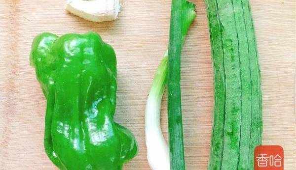3.青椒切粗絲、蔥切段、薑切絲備用