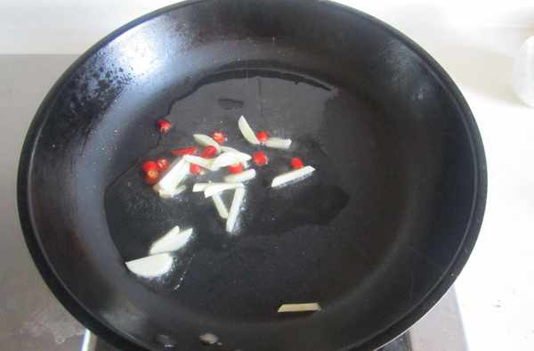 4.熱鍋涼油,放入蒜和紅椒進去煸炒;