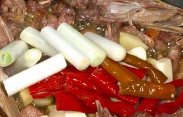 將鴨子炒香,炒至有油滲出,放入生薑、大蒜、蔥結泡海椒,把它炒香出味。