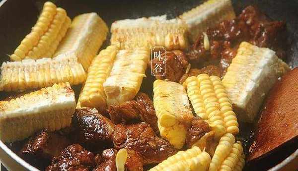 5、炒至排骨變色後倒入玉米塊翻炒一會兒;