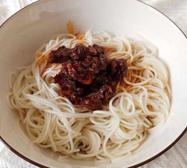 第5步、再將浸涼的面條裝入碗中,按自己的口味加入鹽,味道,胡椒,生抽,醋,最後來一勺美味的玉米牛肉醬。