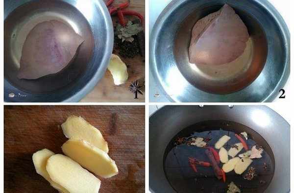 【調料】:生薑一塊、料酒適量、八角兩個、鹽適量、生抽適量、桂皮一段、香葉三片、花椒一小把、泡椒5個