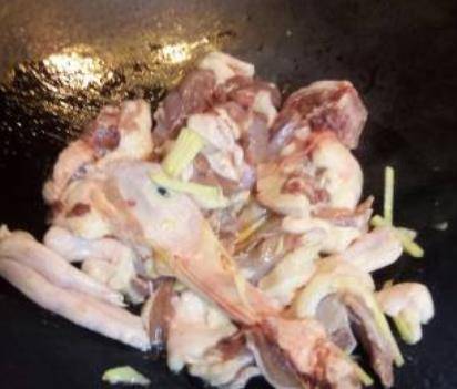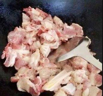 4,鍋中放油,炒鴨肉,要把鴨肉的油炒出來,表面變黃色。炒過之後鴨肉更香,而且不油膩。