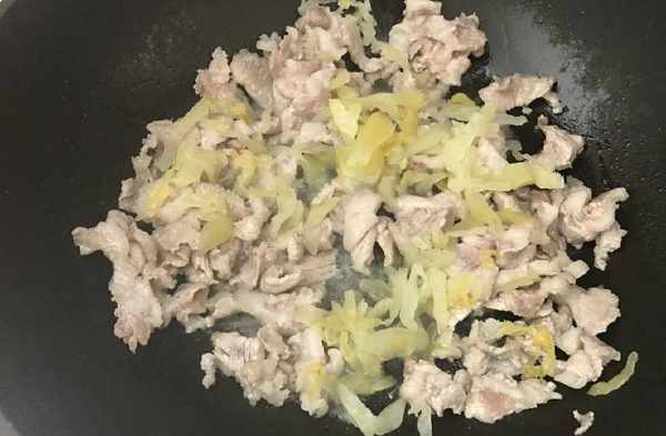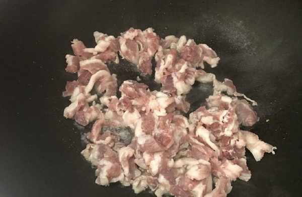 3、熱鍋,加入適量食用油,待油溫升高,倒入瘦肉。