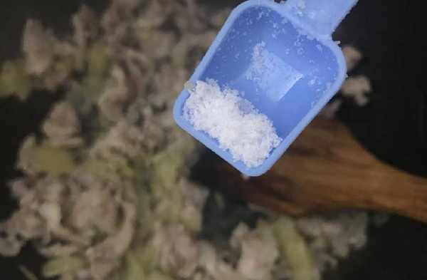 5、加入少許鹽,炒勻。(如果咸菜沒有提前泡水,可以不用加鹽,會比較咸)