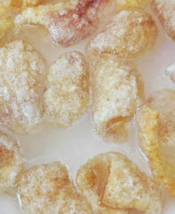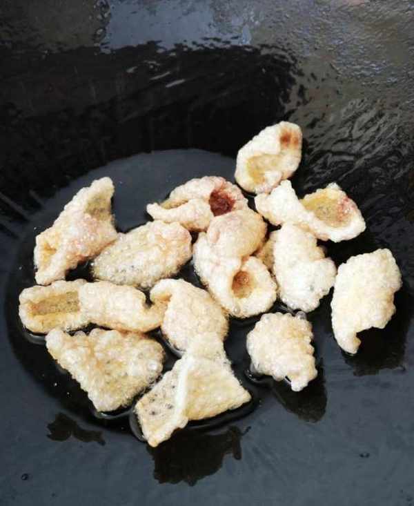 因為火很小,油溫合適,豬皮不會炸糊,而會全部都膨脹起來,達到一個最佳狀態。