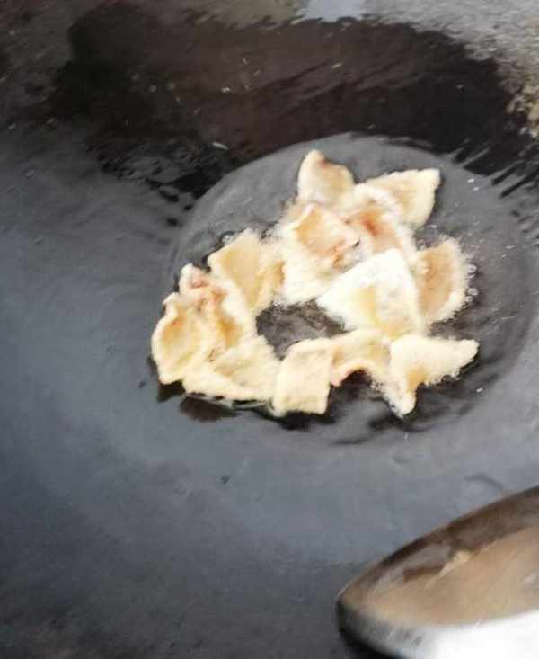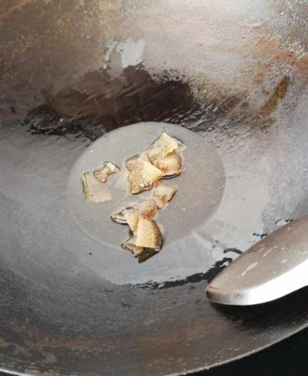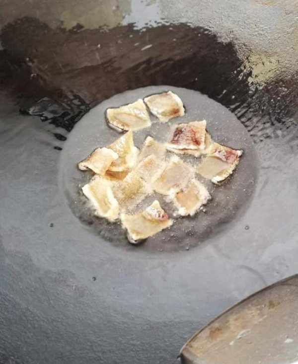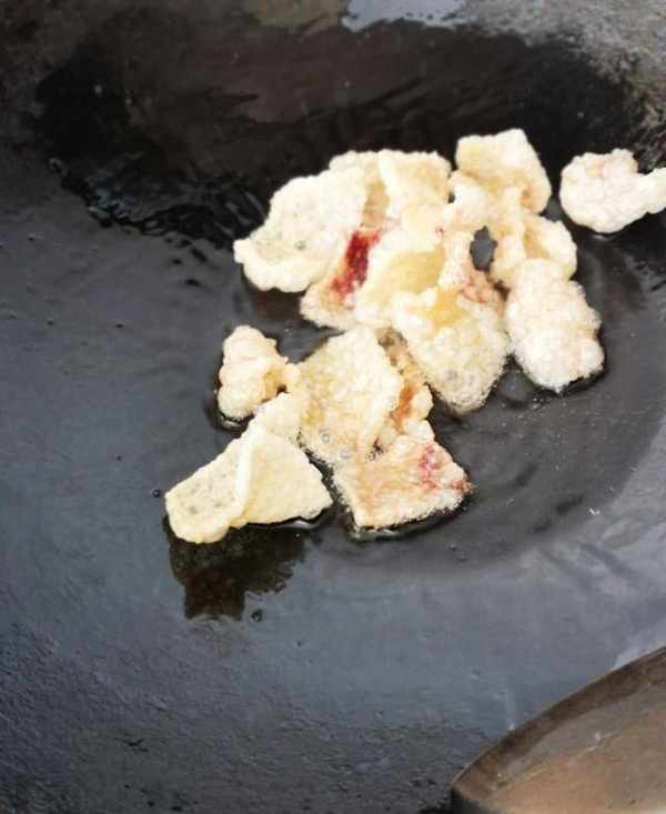 冷鍋中加入少量冷的花生油,煤氣爐打開後關至最小火,馬上倒入曬好的豬皮,用鍋鏟輕輕翻炒,隨著油溫的逐步上升,豬皮開始變軟。