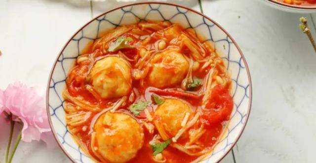 番茄清洗幹凈備用。將金針菇的根除去,清洗幹凈備用。將豬肉切碎,加入薑蓉,鹽,醬油,胡椒,雞精,雞蛋攪拌。