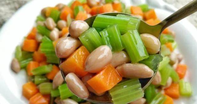 倒入一匙鹽,少許油,倒入芹菜,胡蘿卜丁,一分鐘後取出。