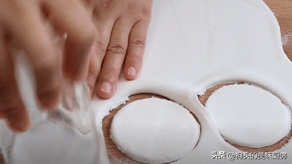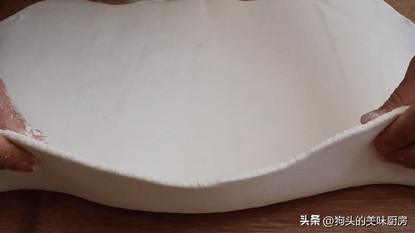 3.不用醒面,直接移到案板上,撒點幹粉防粘,整理一下,把它搟成大面片,厚度0.3-0.5厘米左右。