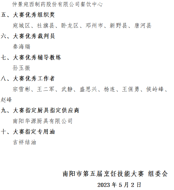 南陽網訊 (記者王鵬)月季花開迎賓朋,激情五月,勞動最美。5月2日下午,2023“豫鑒美食”南陽市第五屆烹飪技能大賽暨酒鄉小鎮首屆美食節頒獎典禮圓滿舉辦,現場宣佈瞭本屆烹飪技能大賽獲獎名單及表彰決定,並為獲獎單位及個人頒獎。
