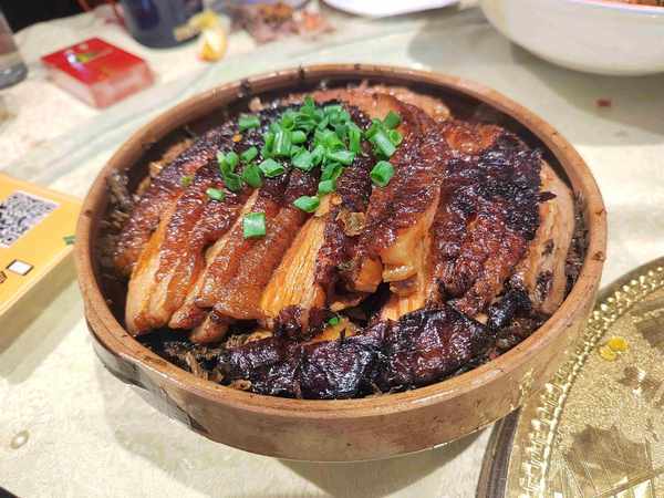 宴席上的扣肉,比傢庭制作的更香一些,這道軟爛入味的扣肉,吸收瞭梅幹菜的風味,吃起來香而不膩,可惜的是份量太少,每人一塊就差不多光盤瞭。