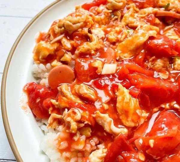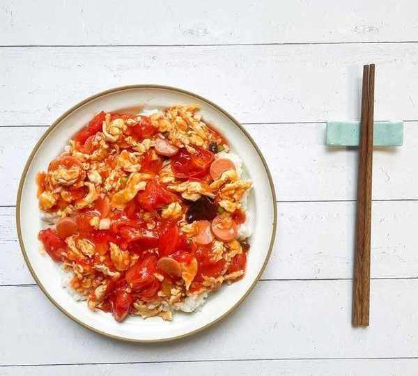 5.炒好的西紅柿雞蛋加入到米飯上就可以吃啦!