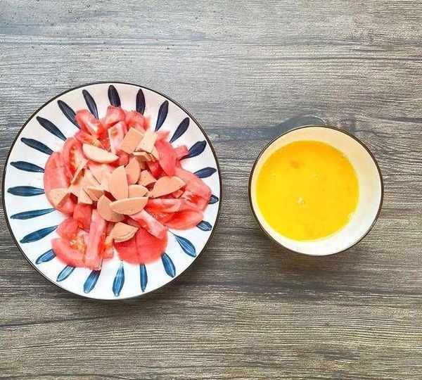 1.鍋中燒水下西紅柿,翻滾去皮以後,與火腿腸一起切丁裝盤備用,雞蛋液攪拌均勻備用;