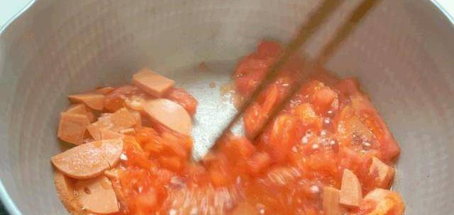 2.鍋中加少量油,加入切好的西紅柿丁以及火腿丁,小火翻炒出汁;