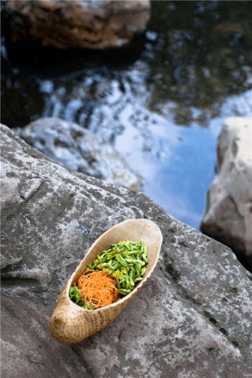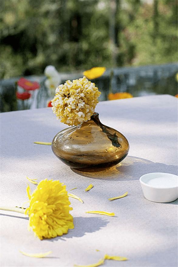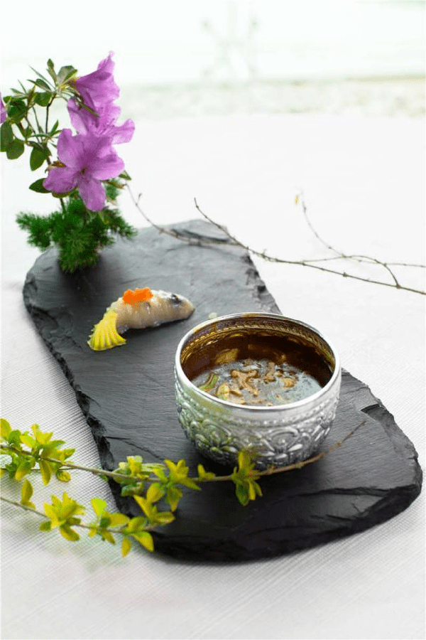 可食用的玫瑰比觀賞玫瑰的顏色要淡,香味也不濃烈,入口略有澀味。陳生合設計瞭兩種極端的方法來吃玫瑰的本味。鮮花小宴上的刺身,不是為瞭應景鮮花的主題。昆明的春天又幹又曬,沒一會兒的工夫就會口幹舌燥,把玫瑰花和高黎貢山上的葛根切片放在冰塊上,佐著一種酸甜咸而有橘香的調味油吃進嘴裡,立刻冰涼潤喉。