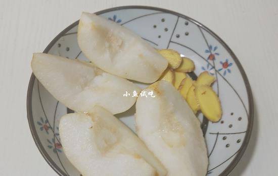 第三步:生薑拍碎或者切成片,雪梨洗凈後對半切開,挖出裡面的籽,不用去皮,果心有點酸,必須要挖出來。