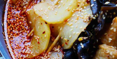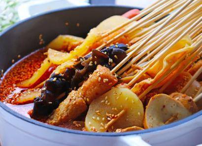 第五步:我們炒出紅油後倒入半鍋雞湯,加入適量的雞精時鹽還有白砂糖,五香粉,醬油,蠔油,辣椒油進行調味,煮三分鐘之後將香料撈出,這個時候湯料就做好瞭,我們再撒上一些白芝麻就可以瞭。我們將已經用竹簽穿好的食材浸泡在紅油中翻滾幾圈,讓它沾取紅油,就可以食用啦!