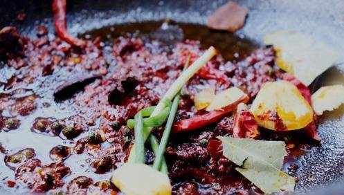 第四步:我們起鍋倒入適量的食用油後,待油溫升高,我們放入蔥薑蒜辣椒,花椒麻椒進行煸炒,然後炒出香味後我們放入豆瓣醬炒出紅油。