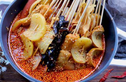 吃雞不見雞,這種竹簽上的經典美食,既不是麻辣燙,也不是串串香,它有一個非常特別的名字:缽缽雞。缽缽雞的食材,無論葷素,基本上以口感帶脆的為主,葷素分開煮熟,一般的缽缽雞能用到雞的部分主要是雞皮,郡肝,雞心等,鴨腸和花腸等味道較重,一般大傢都會用小蘇打抓取均勻醃制後再煮,還有將雞熬煮雞湯,等到所有食材準備好後用竹簽串起來。缽缽雞它源於四川樂山,有著上百年的歷史,它的缽缽是隻瓦罐,我們在缽內倒滿紅油湯汁,再把各種食材煮熟後穿成串浸泡於缽中,吃起來還方便又脆爽,別有一番滋味在心頭。