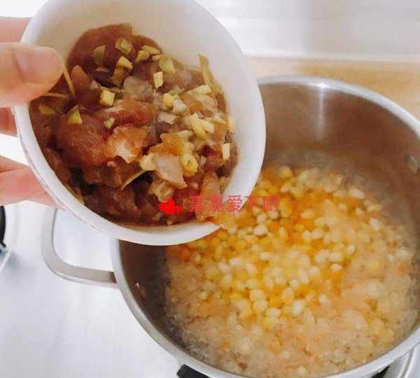 第9步、玉米熟透後放入豬肉,攪拌幾下,不要煮太熟。