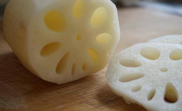 3.把蓮藕洗幹凈刮去外皮,切成兩片連在一起的連刀片,就是第一片和第二片之間在底部的約1/5處相連,不要完全切斷,切好後的藕片,放入清水中浸泡一下,加入少許白醋,這樣可以防止蓮藕氧化變色;
