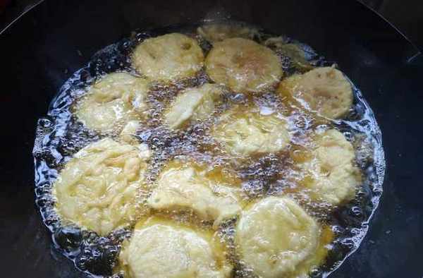 6.炒鍋上火,鍋熱後加入半鍋植物油,油溫5成熱的時候,把藕盒在面糊裡滾一下,讓整個藕盒都均勻沾上面糊,然後馬上下入油鍋裡,中火慢炸;