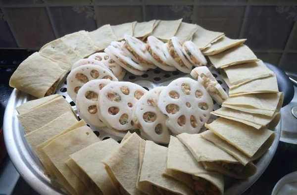 5.取出一對藕片,在中間加入調好的肉餡,用手輕輕壓平,把夾好肉餡的藕盒都排列好;