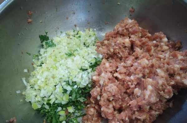 1.把大蔥和老薑洗幹凈,剁成碎末,把香菜也洗幹凈剁成碎末,都放入五花肉餡中;