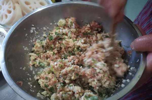 蓮藕2根、五花肉餡1斤、蔥薑適量、香菜2根、生抽2勺、鹽適量、花椒面和胡椒粉少許、蠔油適量、香油少許、面粉150克、淀粉150克、雞蛋1個、清水適量
