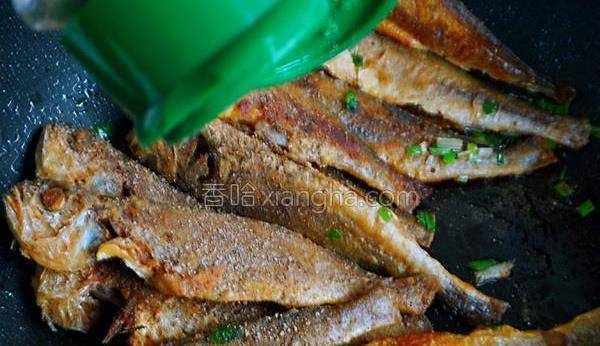 5.黃花魚再放入鍋中,輕輕翻動,撒入椒鹽,顛勺裹勻椒鹽
