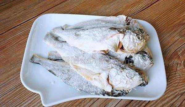 1.黃花魚洗凈內臟,去鱗,裹薄薄一層幹面粉(把多餘幹粉拍掉)