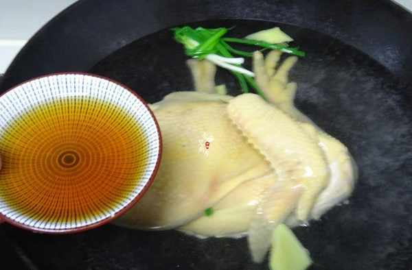 小貼士;煮雞肉沒有一定的時間,要看雞的品質來定,一般20分鐘後可以用筷子戳進雞腿最厚的部位,滲出的沒有血水說明已經熟瞭,出鍋後一定要泡入冰水裡,雞皮才會變得脆嫩,等完全冷掉瞭再斬塊。