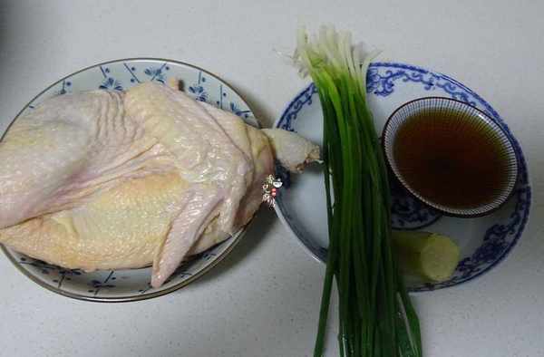 需要的食材;冰鮮雞半隻、橄欖油1湯勺、小蔥一把、黃酒2湯勺、生薑適量、鹽適量、芝麻油少許。